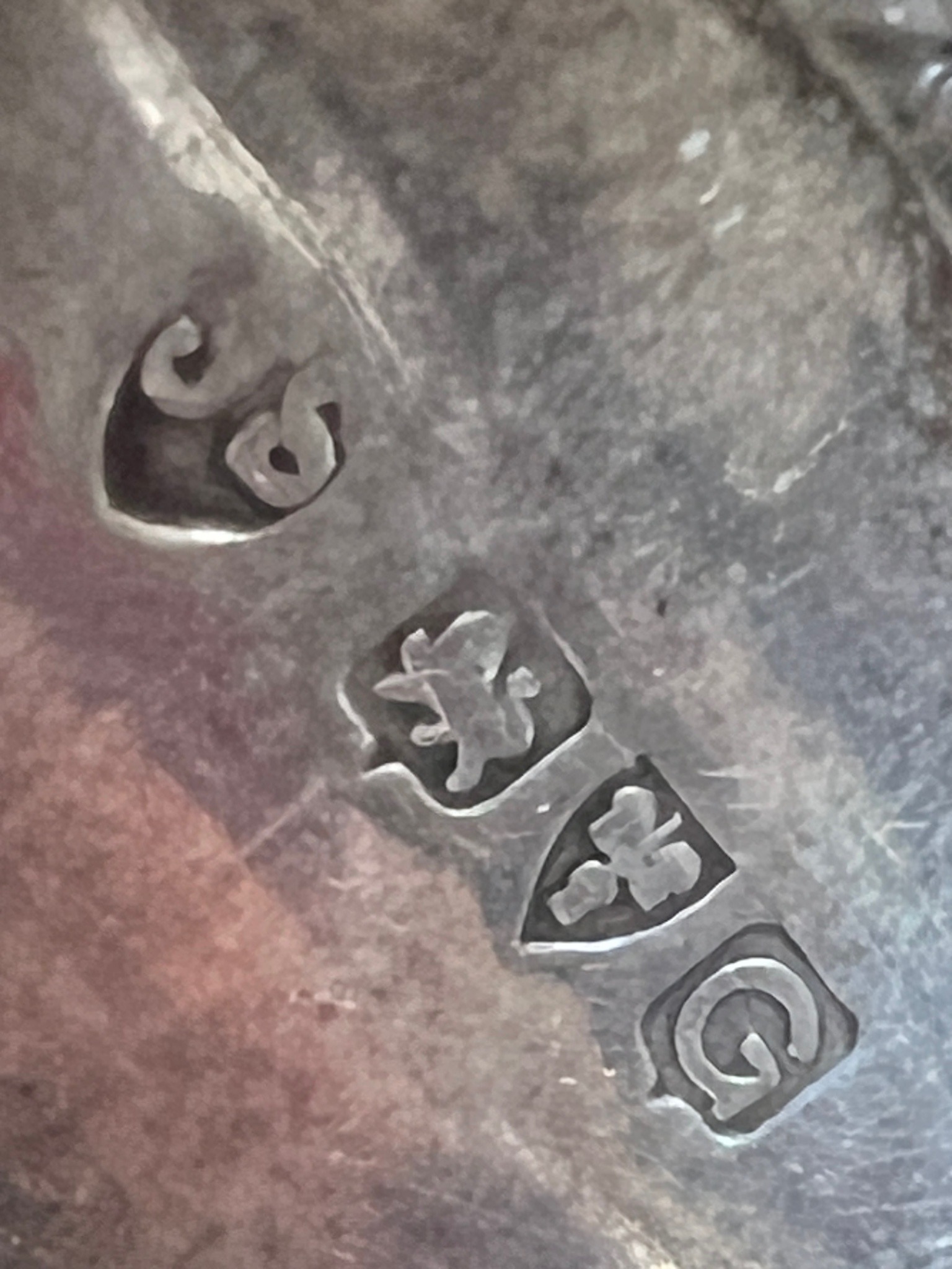This item is a loop-style bangle crafted from 925 sterling silver, weighing approximately 25.3 grams. The piece features a distinct set of four British hallmarks stamped on the interior or reverse surface. The markings include a maker's mark (likely 'JS' or 'SS' in a heart-shaped shield), the 'Lion Passant' which signifies sterling silver fineness (.925), an anchor mark indicating the Birmingham Assay Office, and a date letter 'G' in a stylized cartouche. Based on the specific font and shield shape of the letter 'G', this piece likely dates to the 1981 production year. The metal surface displays a natural age-related patina with fine surface scratches and minor abrasions consistent with regular use, but no structural damage or deep gouges are visible. The craftsmanship is of high quality, typical of mid-to-late 20th-century British silversmithing, featuring crisp stampings and a smooth, well-finished interior. The weight of 25.3 grams provides a substantial feel, indicating a solid construction rather than a hollow shell. The coloration is a classic cool silver gray with deeper tarnish settling into the recessed areas of the hallmarks, which enhances the legibility of the marks.