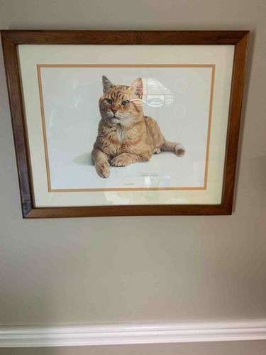 This is a professionally framed and matted print by renowned wildlife artist Charles Fracé, specifically depicting 'Morris,' the famous advertising mascot for 9Lives cat food. The central image features a highly detailed, realistic rendering of an orange tabby cat reclined against a neutral off-white background. The craftsmanship showcases Fracé’s signature photorealistic style, with meticulous attention to the texture of the fur and the expressive character of the eyes. The piece is housed in a medium-toned wood grain frame with a simple chamfered profile. The matting is double-layered with a cream-colored top mat and a thin inner orange/terracotta accent mat that complements the cat’s fur color. The print displays a facsimile signature of Charles Fracé as well as the title 'Morris' centered below the image. Based on the artist's career and marketing tie-ins, this piece likely dates to the late 1970s or 1980s. The condition appears well-preserved under glass; however, there is significant glare in the photo reflecting a ceiling light, though the underlying print seems to be in excellent condition with no visible foxing, fading, or moisture damage. The framing is sturdy, showing minimal scuffing to the wood edges. Fracé worked primarily with American Wildlife Galleries during this era, and these prints were often produced as limited editions on high-quality acid-free paper.