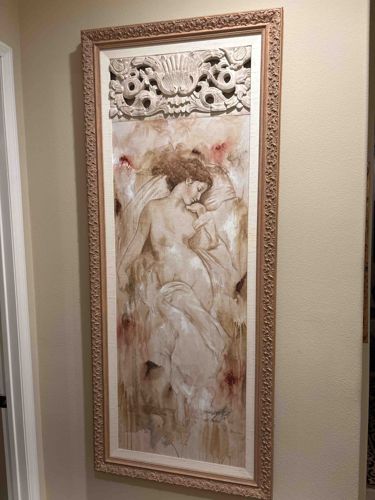 This is a large, vertically oriented mixed-media artwork depicting a reclining female nude in a neoclassical or romantic style. The piece features a distinct two-part construction: a high-relief carved pediment at the top and a painted/lithographed panel below. The upper section consists of a carved wooden or resin architectural element featuring rococo-style volutes and shell motifs, finished in an antique cream or off-white wash. The main panel displays a dreamlike figural composition executed in a muted palette of sepia, ochre, cream, and subtle crimson washes. The figure is rendered with soft, painterly strokes, suggesting a charcoal or watercolor original. The entire composition is set within a matching cream-colored mat and a wide, ornate frame featuring a classic 'cuckoo' or floral guilloché border pattern. The style is contemporary but draws heavily from Art Nouveau and Neo-Romanticism, likely dating from the late 20th to early 21st century. The condition appears excellent with no visible foxing, cracks to the carving, or structural issues. The frame shows consistent finish with no major chips, suggesting well-maintained decorative art produced for high-end interior design markets.