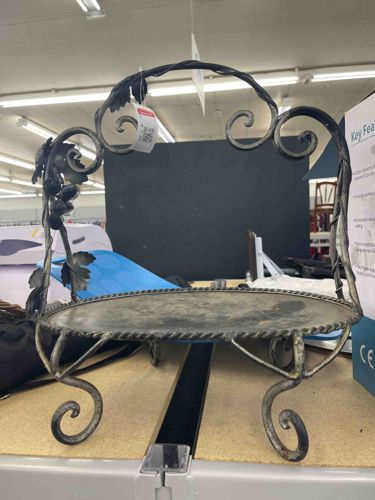 This is a decorative pedestal basket stand crafted from wrought iron with a distressed, antiqued silver and slate-grey finish. The item features a flat, circular oval base platform accented by a twisted rope-style border. The most distinguishing feature is the large, ornate overhead handle that incorporates intricate vineyard motifs, including sculpted metal grape clusters and jagged vine leaves. The structure is supported by four scroll-style cabriole legs that provide a slight elevation. The metalwork shows signs of hand-welding and intentional aging, mimicking a Tuscan or Mediterranean rustic aesthetic from the late 20th century. Condition-wise, it appears structurally sound but exhibits significant surface wear, including possible oxidation, dust accumulation, and scuffing on the flat platform where a ceramic bowl or fruit would typically rest. The silver-toned paint finish is heavily patinated with dark undertones, characteristic of mass-produced decorative home accents designed to look like vintage garden wrought iron. No visible maker's marks are present in the image, suggesting it may be a boutique retail home decor item.