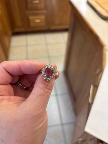 This is a vintage-style cocktail ring featuring a prominent oval-cut raspberry red gemstone, likely a star ruby or a synthetic equivalent, set in an ornate halo design. The central stone exhibits a silky, translucent quality and is held by a series of yellow gold prongs. It is surrounded by a halo of approximately sixteen smaller colorless accent stones, which appear to be either diamonds or white sapphires. The metal is a polished yellow gold, typical of 10K or 14K purity. The construction features a classic 'Lady Di' or ballerina-style cluster setting on a tapered gold band. From a condition standpoint, the ring shows light surface wear on the band and fine scratches consistent with age and occasional use. The star ruby exhibits a soft cabochon polish. No makers marks are immediately visible in the photo, but the style is indicative of mid-to-late 20th-century jewelry design, approximately 1970-1990. The prongs appear intact and well-aligned, suggesting solid craftsmanship. The overall presentation is elegant, with the high-contrast color palette of the red center stone and white accents being a primary visual feature.