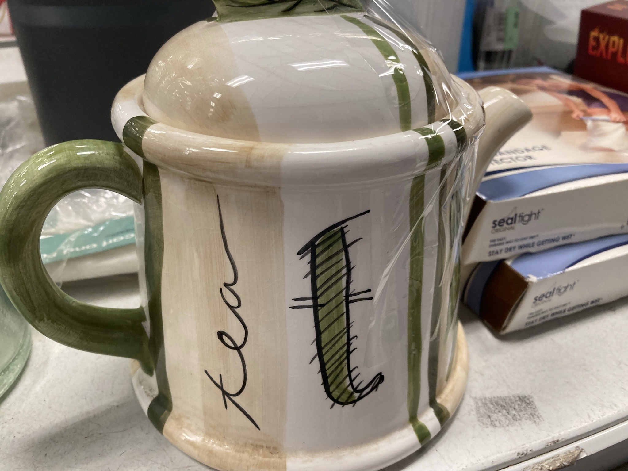 This is a decorative ceramic teapot featuring a whimsical, hand-painted aesthetic. The vessel is constructed of glazed earthenware or stoneware with a cylindrical body and a domed lid. The color palette consists of cream and beige vertical panels accented by thick, grass-green vertical stripes and a solid green handle. The main body features the word 'tea' in a black cursive script alongside a large, stylized letter 'T' that is cross-hatched in green and black, reminiscent of a sketchbook illustration. The lid is topped with a green leaf-shaped finial. Notable features include the heavy glazing, which exhibits extensive fine crazing across the surface—a common indicator of age or intentional aesthetic distressing. This crazing is particularly visible on the lid and the white sections of the pot. The teapot appears to be a mass-market decorative piece, likely from the late 20th or early 21st century, consistent with the 'Richman at home' brand known for kitchenware. While currently wrapped in plastic, the visible condition shows no major chips or cracks beyond the pervasive surface crazing. The craftsmanship is commercial grade, designed for domestic use or display, with a playful, country-chic style.