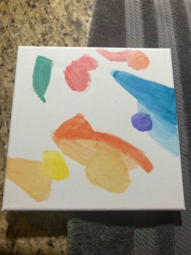 This item is a contemporary abstract artwork executed in watercolor media on a small, square-format gallery-wrapped canvas. The piece measures approximately 6 by 6 inches or 8 by 8 inches based on standard commercial sizes. The composition features a variety of organic and semi-geometric shapes including strokes of teal, coral, peach, lavender-purple, bright yellow, and a prominent diagonal wedge of cerulean blue. The application shows varying translucency, a hallmark of watercolor, allowing the white gessoed texture of the canvas weave to remain highly visible. The paint is applied in distinct, isolated gestures with minimal blending, creating a clean and modern aesthetic. The canvas is stretched over a wooden frame with neatly folded corners, and the image wrap does not appear to exhibit side Painting. Regarding condition, the piece is described as 'clean' and recently created, and visual inspection confirms no signs of foxing, fading, or mechanical damage. There are no visible artist signatures or maker's marks on the face of the canvas. The craftsmanship reflects an amateur or hobbyist contemporary style with a focus on color experimentation and minimalist spacing. The substrate is a standard commercial cotton duck canvas, likely pre-primed, providing a bright white ground that enhances the saturation of the pigments used.
