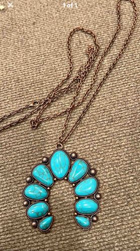 This piece is a contemporary costume jewelry necklace designed in a Southwestern or Western 'Boho' style. The focal point is a large horseshoe-shaped Naja pendant, which is traditionally the centerpiece of a squash blossom necklace. The pendant features ten synthetic blue turquoise stones, likely made of dyed howlite or plastic, which exhibit a uniform 'matrix' pattern intended to mimic natural stone. These cabochons are set in a copper-toned or antiqued bronze base metal. Small decorative metal beads, known as 'navajo pearls' or silver-style droplets in this aesthetic, are placed between the outer edges of the stones. The pendant is suspended from a long, matching copper-finished cable chain with a lobster claw clasp. Regarding condition, the metal shows a consistent antiqued patina which appears to be a manufactured finish rather than natural oxidation. There are no visible chips to the faux-stones, though the overall craftsmanship suggests mass production rather than artisan-made silversmithing. It lacks maker's marks or hallmarks, typical for 21st-century fashion jewelry. The scale is substantial, intended as a statement accessory.