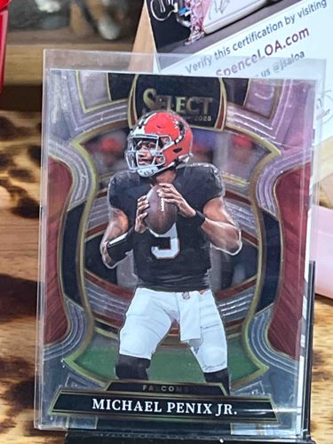 This is a 2024 Panini Select Draft Picks football card featuring quarterback Michael Penix Jr. during his collegiate tenure. The card utilizes a premium chrome-style finish on thick cardstock, consistent with the Select brand's high-end production standards. The design features a stylized decorative border with curved, geometric patterns in shades of gold, burgundy, and silver, surrounding a central action photograph of Penix Jr. in a red and black uniform holding a football. The card is physically protected within a clear soft sleeve and a rigid top-loader, which are standard for maintaining the integrity of collectible cards. Notable text includes the 'SELECT' logo at the top center with '2024' indicated below, the player's name 'MICHAEL PENIX JR.' at the bottom, and his team designation 'FALCONS' just above the nameplate. There is no visible sign of surface scratching or corner softening through the protective layers; however, centering appears slightly shifted towards the right side. The craftsmanship reflects modern sports card manufacturing with intricate holofoil layers and sharp, high-resolution printing. This item is a contemporary sports collectible from the 2024 production year, representing a significant prospect in professional football.