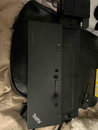 This is a Lenovo ThinkPad Ultra Docking Station, a mechanical docking peripheral designed for high-performance business laptops. The unit is constructed from a durable, matte black high-impact plastic, characteristic of the ThinkPad aesthetic. It features a rectangular, low-profile footprint with a specific proprietary docking connector located in the center-left area, surrounded by mechanical alignment pins and locking mechanisms to secure a laptop. The 'ThinkPad' and 'Lenovo' logos are prominently embossed/printed on the top surface. The rear and sides contain multiple ports, which typically include USB 3.0, DisplayPort, HDMI, VGA, and Ethernet, though these are partially obscured in the image. This specific model appears to be from the CS13 series (likely the 40A2 model), designed for ThinkPad generations such as the T440 through T470. Externally, the item shows moderate signs of use with some surface dust and minor scuffing, but the mechanical mounting components appear intact and functional. No significant cracks or structural damage are visible on the casing. The craftsmanship reflects industrial business standards with precision-molded plastics and a utilitarian design meant for a professional office environment.