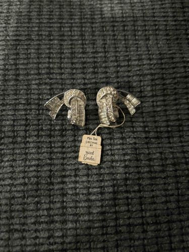 This is a pair of vintage clip-on earrings, likely from the mid-20th century, possibly the 1940s to 1960s, given the 'Plus Tax Original by Miram Bender' tag. The earrings feature an elaborate design characterized by the generous use of clear rhinestones set into a silver-toned metal, which appears to be pot metal or rhodium-plated base metal, common for costume jewelry of this era. Each earring showcases a rounded, stylized bow or ribbon motif with multiple overlapping and flowing elements. The rhinestones are predominantly baguette-cut, set in channels or pavé style, creating a dazzling, continuous sparkle. There are also smaller round brilliants used to fill in gaps and accent the curves. The overall construction suggests a robust build for costume jewelry. The metal shows some degree of patination or tarnish, consistent with age, but no significant damage like broken stones or bent settings is apparent from the image. The clip-on mechanism is visible on one earring, confirming its wear style. The presence of the original tag, though partially obscured, adds a significant historical and collectible value, identifying the maker as Miram Bender and noting it as an 'original' design with a 'Plus Tax' indication, characteristic of pricing from that period. The craftsmanship, with its intricate stone setting and dimensional design, reflects a quality typical of higher-end vintage costume jewelry.