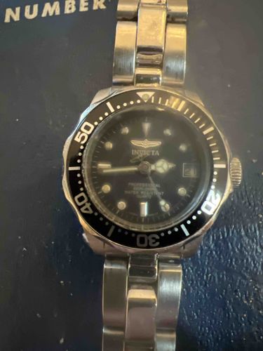 This is a contemporary Invicta Pro Diver wristwatch, likely a women's or mid-size model based on its proportions. The watch is constructed from stainless steel with a circular case and a matching link-style oyster bracelet. It features a black unidirectional rotating bezel with silver-tone Arabic numerals marking the minutes in increments of ten (20, 30, 40, 50). The dial is black and follows a classic diver's aesthetic with luminous dot hour markers, a triangular 12 o'clock marker, and rectangular indices at 6 and 9 o'clock. A date window is visible at the 3 o'clock position, magnified by a 'cyclops' lens on the mineral crystal. The dial is printed with the Invicta winged logo, 'INVICTA', and text indicating 'PROFESSIONAL', 'WATER RESISTANT', and 'QUARTZ' movement. The hands are Mercedes-style with luminous fill. Regarding condition, the watch shows significant signs of wear and age; there are numerous fine scratches ('scuffing') across the stainless steel case and bracelet links, indicating frequent use. The crystal appears somewhat cloudy or scratched, which may affect legibility. The bezel insert shows some minor wear along the edges, and the overall patina suggests a piece from the late 1990s to mid-2000s. The crown is a screw-down or textured push-pull type located at the 3 o'clock position. The construction is robust, typical of mass-market dive-style watches intended for daily durability.