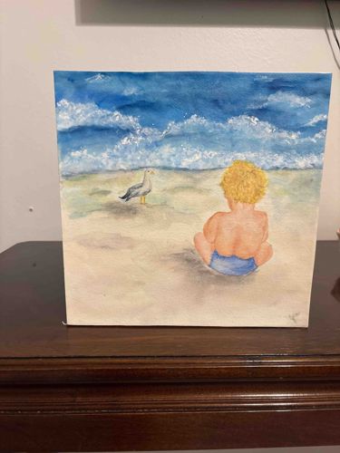 This original work of art is a contemporary watercolor painting executed on a gallery-wrapped canvas. The composition features a narrative scene of a young child with curly blonde hair, viewed from behind, sitting on a sandy beach. The child wears blue swim trunks and faces toward the ocean where a lone seagull stands nearby. The color palette consists of soft cerulean and cobalt blues for the sky and water, muted beige and ochre for the sand, and warm flesh tones for the figure. The ocean is rendered with expressive white-capped waves. As a gallery-wrapped piece, the canvas is stretched over a wooden frame with the painted image or primed surface extending around the edges, intended for display without a traditional frame. There is a small, faint monogram signature visible in the lower right corner, though the artist is currently unidentified. The style reflects a sentimental, impressionistic approach to figural landscape. Overall condition appears excellent with no visible foxing, fading, or mechanical damage to the canvas surface. The use of watercolor on canvas is a specialized technique that requires specific priming to prevent absorption into the fabric, indicating a deliberate and skilled application of the medium.