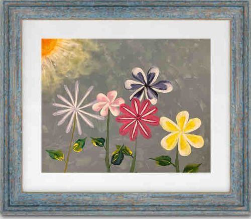 This item is an original painting, likely acrylic or tempera on paper or board, depicting five stylized flowers under a radiant sun. The artwork is created in a naive or folk-art style, characterized by simplified forms and a non-traditional perspective. The flowers vary in shape and color, including a white radial starburst, a soft pink blossom, a bold red flower with white stripes, a blue and white striped petal arrangement, and a vibrant yellow bloom. In the upper left corner, a bright orange and yellow sun emits textured rays against a muted grey, mottled background. The paint application appears impasto-like in certain areas, particularly around the sun and the flower petals, suggesting a tactile surface quality. The piece is professionally mounted with a clean white mat board and housed in a distressed, blue-washed wooden frame with ornate molding details. The frame shows intentional weathering and patina consistent with a coastal or shabby-chic aesthetic. Overall condition appears excellent with no visible foxing, fading, or mechanical damage to the artwork or the glazing. The craftsmanship suggests a contemporary work intended for interior decoration, likely produced in the late 20th or early 21st century.