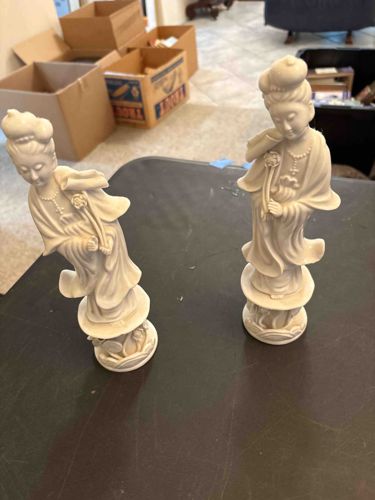 This is a pair of vintage Chinese figurines, consistently styled in the 'Blanc de Chine' (Dehua porcelain) tradition, depicting the bodhisattva Guanyin. Each figure stands approximately 10 to 12 inches tall and is crafted from a creamy, off-white porcelain with a soft matte or eggshell finish. The figures are depicted in flowing, traditional robes that convey a sense of movement, standing atop ornate circular lotus pedestals with scalloped detailing. Notable features include finely detailed facial features, high topknot hairstyles (chignons), and delicate beaded necklaces with cross-like pendants. One figure holds a long-stemmed lotus flower, a symbol of purity. The craftsmanship shows intricate molding, particularly in the deep folds of the drapery and the serene expressions. In terms of condition, the figures appear physically intact without large visible chips or cracks from this distance, though a fine layer of surface dust and minor age-related patina are present. There are no immediately visible maker's marks or signatures on the exterior, which is common for mid-20th-century decorative pieces of this style. These likely date to the mid-to-late 20th century, reflecting a neoclassical revival of Ming Dynasty aesthetics. The uniformity of the pair suggests they were manufactured as a matching set for export or domestic decorative use, characterized by high-quality slip-casting and hand-finishing.