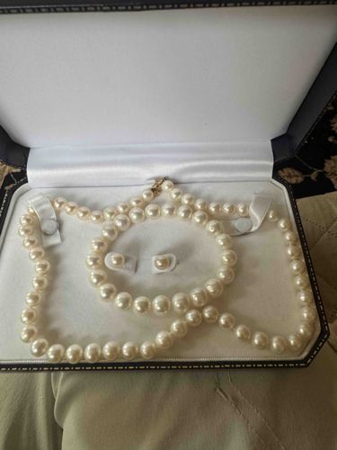 This classic jewelry ensemble consists of a single-strand princess-length necklace, a matching single-strand bracelet, and a pair of stud earrings. The set features round to near-round pearls, likely cultured Akoya or high-quality freshwater, exhibiting a creamy white body color with faint rose overtones. The pearls appear to be approximately 7mm to 8mm in diameter, demonstrating excellent luster and a smooth surface texture across the collection. The necklace and bracelet are traditionally hand-knotted on silk thread with visible knots between each pearl to prevent friction and provide security. The necklace is secured with a yellow gold-toned decorative fishhook or filigree clasp, suggesting a mid-to-late 20th-century manufacture. The overall condition is excellent, showing well-maintained surfaces without significant nacre erosion or discoloration. The presentation case is a hardshell box lined with white satin and velvet, featuring ribbon stays for the necklace and dedicated slots for the earrings and bracelet. This set represents a timeless aesthetic, often associated with bridal or formal attire, characterized by high-quality craftsmanship and uniform matching of the pearl spheres.