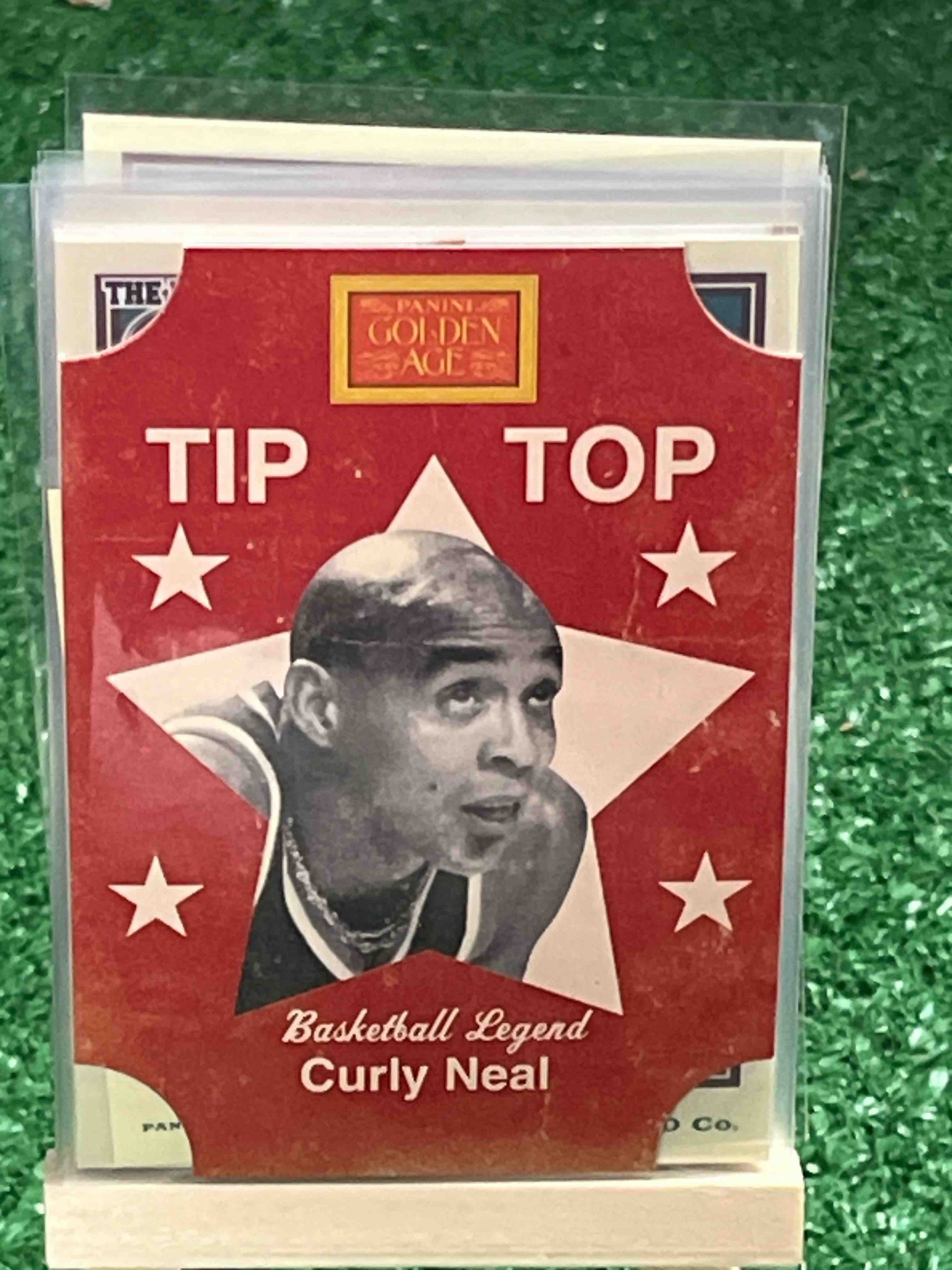 This is a 2012 Panini Golden Age 'Tip-Top' series insert trading card featuring the legendary Harlem Globetrotter, Curly Neal. The card mimics the vintage aesthetic of mid-20th-century bread labels, specifically the Tip-Top Bread brand. It features a distinctive die-cut scalloped top and bottom edge, characteristic of this specific insert set. The color palette is dominated by a deep red background with a large white five-pointed star framing a black-and-white portrait of Curly Neal. Smaller white stars are positioned in the top corners and mid-section. The top of the card bears the 'Panini Golden Age' logo and the 'TIP TOP' brand name in white block lettering. At the bottom, 'Basketball Legend Curly Neal' is printed in a white script font. The card appears to be in used condition; visible through the protective plastic sleeve are surface scuffs, small white specks of paper loss or printing artifacts, and some softening of the die-cut corners. The card is housed in a clear plastic penny sleeve and displayed on a white stand against a green textured background. This modern card captures a retro style, celebrating sports icons through a design that evokes 1950s Americana advertising.