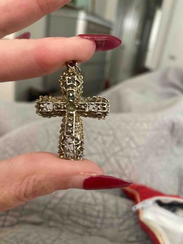 This item is an ornate, three-dimensional cross pendant featuring intricate openwork filigree and granulation techniques. Measuring approximately 1.5 to 2 inches in height, the piece is constructed from a gold-toned metal, likely gold-plated silver (vermeil) or a high-quality costume alloy given the visible surface oxidation. The design is characterized by a central Latin cross overlaid onto a wider, cage-like structure formed by delicate wire scrolls and milgrain-edged floral or scalloped motifs. Tiny metallic spheres (granulations) are strategically placed along the central axes of the cross for added texture and visual interest. The construction is hollow or 'puffed,' giving it a substantial profile without excessive weight. In terms of condition, the pendant shows a noticeable aged patina with dark oxidation nestled in the deeper recessed areas of the filigree, and some thinning of the gold plating on high-friction points, which is consistent with mid-20th-century vintage jewelry. While no specific maker's marks are clearly visible in the image, the style is reminiscent of Mediterranean or Etruscan revival jewelry from the 1950s-1970s. The craftsmanship is high, evidenced by the symmetry of the wirework and the secure integration of the jump ring at the apex.