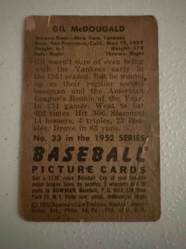 1952 Bowman Gil McDougald Baseball Card #33 (Reverse Side)