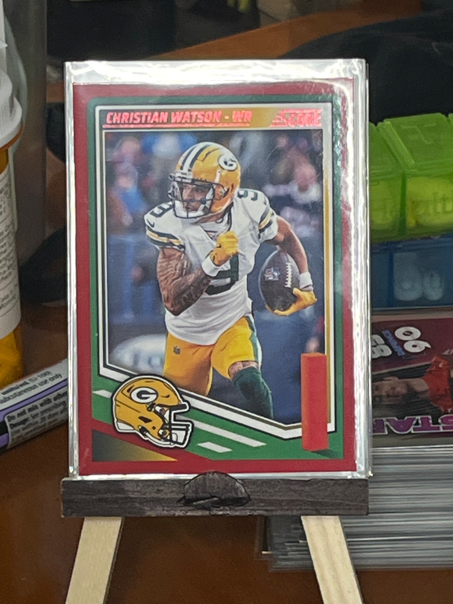 This is a modern American football trading card featuring wide receiver Christian Watson of the Green Bay Packers. The card is from the Panini 'Score' brand, likely the 2023 edition given the contemporary photography showing Watson in his current team uniform (white away jersey, yellow pants with green stripes, and yellow helmet). The card construction consists of standard cardstock with a glossy printed finish. This specific variation features a vibrant red border, which is a common parallel design used in the Score series to denote rarity or retail-specific distribution. The design includes the player's name and position 'WR' at the top in a red and gold stylized font, a 'Score' logo in the upper right, and a Green Bay Packers helmet logo in the lower left corner against a stylized green field background. The card is currently housed inside a clear protective plastic penny sleeve and then secured within a thicker, rigid top-loader for preservation. Based on visual inspection, the card appears to be in 'Near Mint to Mint' condition; the corners look sharp through the plastic, and the centering of the image within the red border seems relatively balanced, although the sleeve adds some glare. No visible creases, surface scratches, or ink fading are apparent in this view. As a modern sports card, the primary value is derived from the player's performance, the brand series, and the specific rarity of the red border parallel.