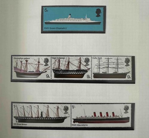 This collection consists of six commemorative postage stamps issued by the British Royal Mail in 1969, featuring iconic maritime vessels throughout history. The stamps are presented in three distinct strips or fragments. The top single stamp is a 5d value depicting the RMS Queen Elizabeth 2 on a vibrant turquoise background. The middle horizontal strip contains three 9d stamps illustrating an Elizabethan galleon, an East Indiaman, and the Cutty Sark. The bottom strip includes a 1/- stamp showing the SS Great Britain and another 1/- stamp featuring the RMS Mauretania. Each stamp includes a right-facing silhouette of Queen Elizabeth II in the upper corner, following the traditional Machin-inspired design. The stamps are printed on paper with fine perforations visible along the edges. The color palette varies from monochromatic grayscale for the ships to primary tones like teal and red accents on the liners. The condition appears to be mint or lightly used, with no visible heavy cancellation marks, though they seem to be mounted on a light-colored collector's card or a black philatelic backing strip. The typography is a clean, modern sans-serif, reflecting late 1960s graphic design trends. Such stamps were designed by iconic artists like David Gentleman and remain popular among maritime and British philatelists.