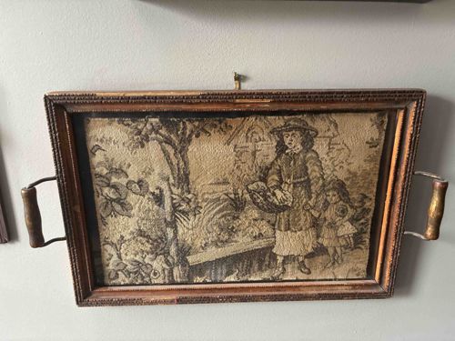 This rectangular serving tray features a detailed needlepoint or petit point panel encased under glass. The needlework depicts a pastoral or garden scene with two figures, likely a woman and a child, dressed in early 20th-century attire. The textile exhibits a muted, sepia-toned color palette of creams, browns, and blacks, which is indicative of significant age and light exposure. The frame is constructed from dark-stained wood with decorative beaded molding along the inner edge. It is equipped with two lateral metal handles featuring turned wooden grips, designed for utility. The condition shows visible signs of wear consistent with an antique piece: the wooden frame has several scuffs, finish loss, and minor chips, while the wooden handles show signs of frequent use with worn lacquer. The needlework panel appears slightly yellowed with age, and there are small gaps visible where the fabric meets the frame. This piece reflects a style popular in the early 1900s, where domestic handicrafts were integrated into functional household items. The craftsmanship of the needlepoint displays tight, uniform stitching, suggesting a high degree of skill in its creation.
