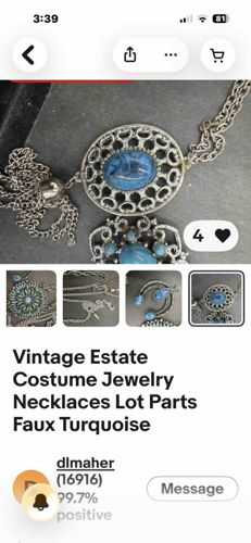 This item is a collection of vintage estate costume jewelry pieces, primarily featuring silver-toned metal work and faux turquoise elements. The focal point of the main image is a large, oval-shaped openwork pendant with a filigree or scrolled open-lace design. At the center of this pendant is a cabochon stone in a mottled blue shade, mimicking the appearance of turquoise or matrix-heavy lapis. The metal appears to be a base alloy with a silver-colored plating, exhibiting some surface wear and minor oxidation consistent with vintage costume jewelry. The construction includes a double-link or figure-eight style chain. Attached to one end of the pendant is a substantial chain tassel, a popular design element in mid-20th-century costume jewelry. Additional pieces in the lot include a circular medallion with radiating floral motifs and smaller blue cabochons, as well as several loose chains and components. The style is indicative of the 1960s or 1970s revivalism, often associated with brands like Sarah Coventry or Monet, although no specific maker's mark is clearly visible in the provided photos. The condition appears fair, showing signs of age and typical 'estate' wear, which includes slight tarnishing of the metal finish.