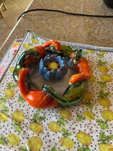 This is a vintage ceramic decorative piece featuring a circular arrangement of stylized swans surrounding a central floral motif. The item measures approximately 6-8 inches in diameter. Constructed from molded earthenware, it is finished with a vibrant mid-century luster glaze. The design features six interlocking swans in alternating colors of iridescent forest green and bold orange/coral. Each swan exhibits a curved, elongated neck and simplistic feather detailing on the wings. The center holds a blooming lotus-style flower bowl in a contrasting periwinkle blue luster, containing what appears to be a yellow floral center or wax residue. The high-gloss metallic finish is characteristic of the 1940s-1950s era. Notable features include the rhythmic, geometric composition and the use of lusterware techniques pioneered by companies like Hull or similar Japanese exporters of the period. The condition appears fair for its reported age of 70+ years; the glaze maintains a high shine, though some fine crazing and small surface abrasions are visible upon close inspection, particularly on the swan heads. No major cracks or structural repairs are evident in the provided view. The craftsmanship displays a balance between mass-produced mid-century charm and detailed hand-finishing.