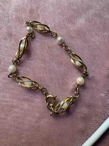 This vintage link bracelet features a sophisticated repeating design of openwork, stylized leaf or pod-like gold-tone metal cages. Each cage is crafted with a textured, milgrain-style edge and holds a small, white bead or imitation pearl nestled within its center. Interspersed between these decorative leaf links are individual white pearls mounted on metal pins and connected by simple jump rings. The construction is articulated, allowing for flexibility on the wrist, and is finished with a classic spring ring clasp. The metal displays a warm yellow-gold luster with slight darkening or patina in the recessed areas, which is consistent with age and typical of gold-plated or high-quality costume jewelry. The pearls show a soft, iridescent sheen, though close inspection suggests they are likely faux pearls. Based on the filigree-inspired metalwork and the style of the clasp, this piece likely dates to the mid-20th century, approximately 1950s-1960s. The overall condition appears good with minor surface wear on the metal and pearls. No obvious maker's marks are visible in the image, but the piece demonstrates refined mid-century costume jewelry craftsmanship.