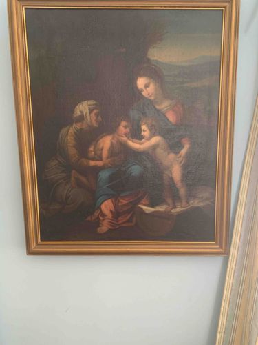This item is an oil-on-canvas or oil-on-panel painting depicting the 'Madonna of the Divine Love', a composition originally attributed to the High Renaissance master Raphael. The scene features the Virgin Mary and Saint Elizabeth with the infant Jesus and Saint John the Baptist in a lush landscape setting. The figures are arranged in a classical pyramidal composition, with Saint Elizabeth on the left and the Madonna dominating the center-right. The color palette is composed of rich, traditional Renaissance hues including lapis-like blues, deep crimson, and earthy umbers. The painting is housed in a modern, tiered goldleaf-finish wooden frame with a beaded inner edge. Regarding condition, the surface exhibits significant darkening of the varnish, which has yellowed over time, obscuring some of the finer details in the background and drapery. There is visible craquelure across the surface consistent with an aged oil medium, particularly in the lighter flesh tones. No immediate signatures or maker's marks are visible on the front, suggesting it may be a 19th-century or early 20th-century academic copy or an older devotional work after the original masterpiece. The smooth blending of shadows (sfumato) and the soft anatomical rendering indicate a high level of technical skill in reproducing the original's aesthetic. However, the overall dimness of the work suggests it would benefit from professional conservation and cleaning.