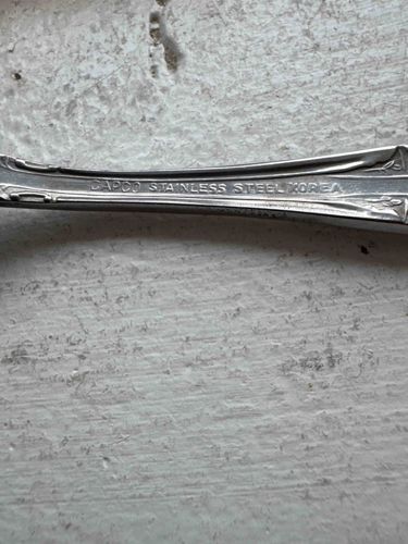 This is a detailed view of a stainless steel flatware handle, specifically the neck and back portion. The item is constructed from stamped stainless steel with a polished silver-tone finish. It features a traditional decorative pattern characterized by raised scrolling edges and small floral or foliate accents near the transition points. Centered on the flat reverse side of the handle is a clear manufacturer's hallmark reading 'CAPCO STAINLESS STEEL KOREA', which indicates mass-production from approximately the late 20th century (1970s-1990s). The craftsmanship is consistent with mid-grade utilitarian kitchenware designed for durability and ease of maintenance. Visible condition issues include fine surface scratches, micro-pitting, and some dark residue within the stamped lettering and crevices of the decorative border, typical of regular use and age. The piece shows no signs of bending or major structural failure, exhibiting the standard patina of household flatware that has been through many cleaning cycles.
