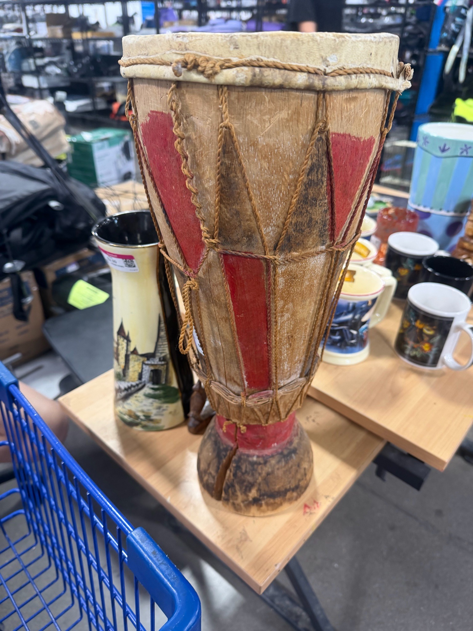 This is a hand-carved goblet-shaped drum, likely of African or Caribbean origin, featuring a single-piece wooden body. The construction exhibits traditional techniques, including a rawhide skin head secured by a complex network of woven fiber ropes. These ropes are tensioned in a geometric V-pattern across the upper two-thirds of the drum to maintain the skin's pitch. The wood displays a natural, coarse grain and is decorated with hand-painted red and black vertical triangular panels and stripes. In terms of condition, the item shows significant signs of age and ethnographic use. Most notably, there is a large structural crack through the rounded pedestal base, along with several smaller vertical splits in the wood. The paint is faded and worn throughout, and the rawhide head shows darkening and accumulation of dust. The rope tensioning system appears intact but aged, with some fraying. There are no visible maker's marks, suggesting it is an authentic piece of folk art or a handcrafted tourist trade item, likely dating from the mid-to-late 20th century. The craftsmanship is rustic yet sturdy, reflecting a functional musical instrument design with aesthetic tribal motifs.
