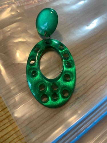 This item is a single costume jewelry dangle earring featuring a vibrant emerald green metallic finish. The piece is constructed from two primary components: a small, oval-shaped top stud portion and a larger, elliptical drop connected by a dark metal jump ring. The material appears to be a lightweight molded resin or acrylic, infused with a fine metallic shimmer or mica flake that provides significant depth and luster. The larger drop section features a prominent central oval cutout surrounded by an asymmetrical pattern of various-sized circular perforations and dimpled indentations, creating a textured, organic 'swiss cheese' or bubbled aesthetic. The surface is smooth with a high-gloss finish that reflects light across its curved edges. Regarding condition, there are minor surface abrasions and micro-scratches consistent with wear and age. The luster remains high, though some darkening is visible on the connecting hardware. This style is characteristic of 1980s or early 1990s statement jewelry, prioritizing bold geometry and vivid colors. No manufacturer's marks are visible on the front; the rear of the piece, though not fully shown, likely contains a standard post or clip-on mechanism.