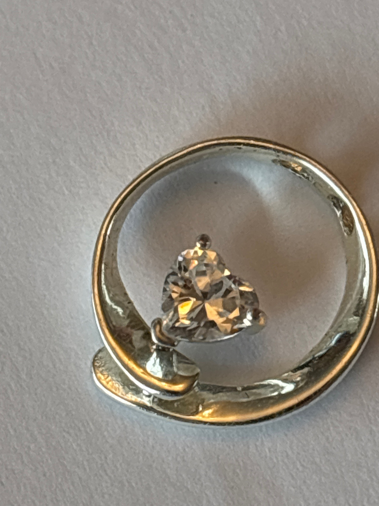 This item is a contemporary fashion jewelry pendant featuring a heart-shaped brilliant-cut stone, likely cubic zirconia or a similar synthetic stimulant, set within a bypass-style circular frame. The metal appears to be silver-toned, possibly sterling silver or rhodium-plated base metal, and exhibits a bright, high-polish finish. The central stone is secured by three rounded prongs, positioned to showcase the heart's symmetry. The outer circular frame is not a perfect closed loop; rather, it features a fluid, bypass design where the ends overlap slightly at the base. The construction is lightweight and characteristic of mass-produced modern jewelry. On the interior of the bail/ring, there are faint indentations that may represent hallmark stamps (such as '925'), though they are not clearly legible in the current view. Condition-wise, the piece shows minor surface abrasions and light scratches consistent with gentle wear. There is a slight yellowing or reflection on the lower curve, which may be a patina or simply a reflection from the surrounding environment. The stone appears securely set with no visible chips or fractures, maintaining a high degree of clarity and dispersive 'fire'. This style is indicative of late 20th to early 21st-century romantic-themed accessory design.