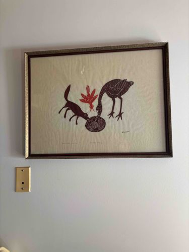 This item is a framed Inuit stonecut print titled 'Greedy Wolf' by the renowned Cape Dorset artist Kananginak Pootoogook. The artwork depicts a stylistic scene of a wolf and a goose competing over a shared food source, rendered in a two-tone palette of dark charcoal and earthen red. The figures exhibit the characteristic simplified, rhythmic forms and decorative interior patterning associated with the West Baffin Eskimo Co-operative printmaking style. The medium is stonecut on a textured, off-white handmade paper, which displays visible rippling and undulation, likely due to improper mounting or humidity changes over time. The print includes pencil inscriptions at the bottom edge, identifying the title, technique, and artist's signature in syllabics and English. It is housed in a simple, dark wood frame with a metallic inner lip. There are signs of aging, including yellowing of the paper and minor scuffing on the frame's edges. Kananginak (1935–2010) was a pivotal figure in the development of Northern graphic arts, and this piece likely dates from the late 1960s to mid-1970s, representing a classic period of Inuit artistic expression.