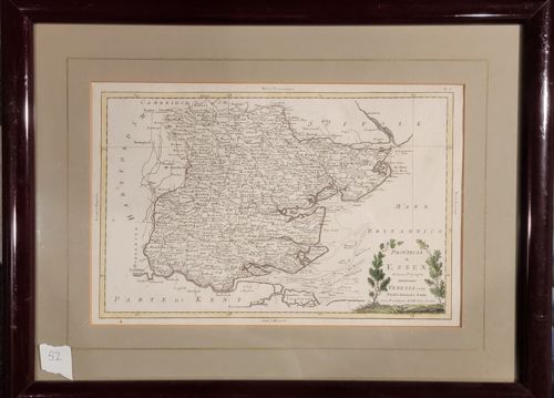 This is a framed antique engraved map of Essex, England, featuring a decorative title cartouche in the lower right corner adorned with botanical motifs. The map is printed on cream-colored paper with fine black ink line work, supplemented by subtle hand-colored outlines along the county borders. It depicts geographical features including towns, rivers, and coastal details, with surrounding regions labeled such as 'Suffolk', 'Hartfordia', and 'Parte di Kent'. The text appears to be in Latin or an older orthography, with the title 'Provincia di Essex' clearly visible. Physically, the map is housed in a contemporary double-mat of neutral beige tones and a dark mahogany-finished wood frame with a high-gloss sheen. Visible condition issues include some light foxing and minor discoloration consistent with age, particularly along the fold lines and the outer margins of the paper. There are also slight surface scuffs on the wood frame and a small white lot sticker numbered '52' on the lower left of the glazing. The style of engraving and the cartographic details suggest a 17th or 18th-century origin, possibly from an atlas such as those by Blaeu or Janssonius. The precision of the line work and the quality of the plate Impression indicate high-standard historic craftsmanship.