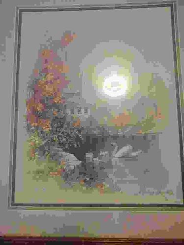 This item is a large-format needlework piece, likely a cross-stitch or needlepoint, depicting a serene landscape scene. The central composition features a white swan gliding across a shaded body of water, set against a background of a large, glowing sun or moon that dominates the upper quadrant. To the left, a tall structure or dense flowering tree with vibrant red and orange tones adds a vertical element to the work. The color palette is characterized by soft, blended tones of grey, lavender, and muted greens, contrasted by the sharp warmth of the sun and the red foliage. The piece is housed in a simple, thin silver-toned or metallic frame with a dark inner border. The stitching appears dense and uniform, suggesting a high level of patient craftsmanship, common in commercial kits from the late 20th century (circa 1970s-1990s). The image quality shows some pixelation, but the overall condition of the needlework seems stable without visible fraying, fading, or moisture staining. The framed piece measures approximately 18x24 inches. No visible signature or maker's mark is discernible in the lower corners, which is typical for hobbyist-completed textile art of this style period.