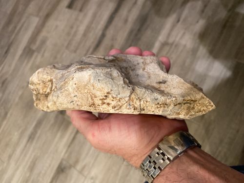 This specimen is a large lithic object identified as a Lower Paleolithic chert hand axe and scraper, measuring approximately 7 inches in length and 3.5 inches in width. The item is composed of a dense, cryptocrystalline sedimentary rock (chert) displaying a mottled tan, beige, and light gray color palette. It exhibits various surface textures, including smooth, weathered areas and more jagged, percussion-flaked edges consistent with intentional lithic reduction techniques. The object possesses a distinct ergonomic design, featuring a weighted base or 'butt' that fits comfortably into the palm, tapering towards a sharper longitudinal edge intended for scraping or cutting. There are visible patches of reddish-brown mineral staining and heavy patina, suggesting long-term exposure to soil minerals and significant age. Notable features include what may be interpreted as 'portable rock art'—surface contours and flake scars that, in certain lighting and orientation, appear to represent an effigy or zoomorphic form, though such features are often subjective in Paleolithic artifacts. The condition is stable, showing hundreds of thousands of years of natural weathering, micro-pitting, and edge wear consistent with a utilized prehistoric tool. The absence of modern mechanical grinding marks confirms its percussion-based manufacturing origin.