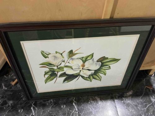 This item is a large-format botanical artwork featuring two prominent white magnolia blossoms accompanied by lush green leaves and budding branches. The central image is set against an off-white or light cream-colored rectangular field, which is further embellished by a sophisticated double-matting system. The inner mat is a neutral cream, while the outer, larger mat is a deep forest green, providing a high-contrast decorative border that draws the eye toward the floral subject. The artwork is housed within a dark mahogany or cherry-finished wooden frame with a subtle tiered profile. Physically, the piece appears to be a color lithograph or a high-quality reproduction print on textured paper, characteristic of late 20th-century traditional home decor (circa 1980s-1990s). The colors of the magnolias are rendered with soft, graduated shading in grays and yellows to provide depth, while the leaves feature varying shades of olive and emerald green. Condition-wise, the frame shows some minor surface scuffs and dust accumulation along the lower edge, and there is a slight reflection on the glass indicating the presence of standard glazing. The overall craftsmanship suggests a mass-produced but well-executed decorative piece aimed at a classic or southern-style interior aesthetic. No visible artist signature or edition number can be definitively identified from the primary angle, though they may be present under the matting or in a lower corner not clearly visible in the lighting.