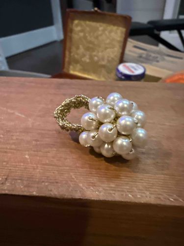 This item is a statement cocktail ring featuring a prominent hemispherical cluster of approximately 20 to 25 white simulated pearls. The pearls are uniform in size and spherical in shape, possessing a high-luster, cream-ivory finish characteristic of glass or plastic beads with an essence d'orient coating rather than organic growth. The beads are wired individually onto a central base using gold-toned metal pins, which are visible at the apex of each pearl, creating a textured 'grape cluster' or 'pompom' aesthetic. The ring's band is a distinctive flexible stretch design, constructed from a metallic gold-tone woven mesh or braided elastic material. This design indicates a one-size-fits-all approach common in mid-to-late 20th-century costume jewelry, likely dating from the 1960s to the 1980s. The construction is indicative of mass-produced fashion jewelry where versatility of fit was prioritized over precious metal hallmarks. The visible condition appears fair to good; the pearl finish shows minor surface reflective consistency, though simulated pearls of this type are prone to 'peeling' or yellowing over time if exposed to oils or perfumes. No specific maker’s marks are visible on the exterior, suggesting it may have been branded via a hang-tag or card at the original point of sale.