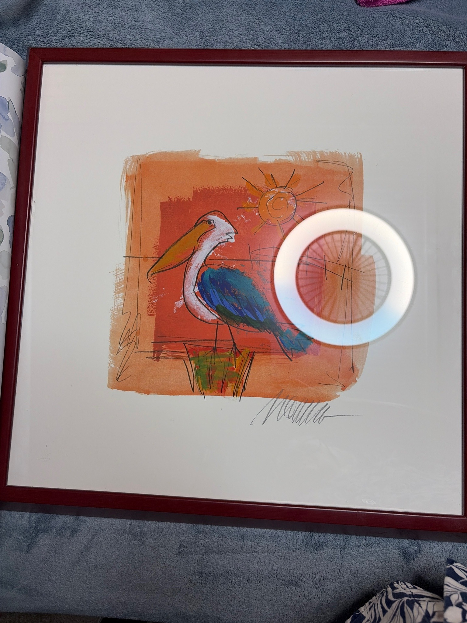 This is a vibrant and colorful work of art, likely a mixed media lithograph or serigraph, by the world-renowned pop artist Peter Max. The central image features a stylized pelican rendered in bold, whimsical brushstrokes against a warm sunset-inspired background. The color palette is dominated by intense oranges, deep reds, and varying shades of blue and green on the bird's plumage. The artwork exhibits Max's signature Neo-Expressionist style, blending graphic line work with fluid, painterly textures. In the lower right corner, there is a prominent, fluid graphite or marker signature, characteristic of the artist. The image is centrally positioned on a large white paper substrate, which is a common presentation for his smaller editioned works or posters. It is housed in a simple, thin burgundy-toned frame with a protective glazing, although a ring-light reflection is visible in the photograph. The condition appears to be excellent with no visible foxing, yellowing, or paper degradation, though it would require inspection outside of the frame for a final condition report. The piece exemplifies the optimistic and psychedelic aesthetic that Max popularized beginning in the late 1960s, though this specific piece likely dates from the late 20th or early 21st century given the refined line work.