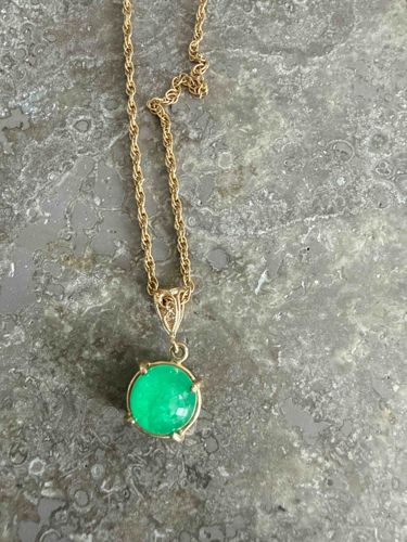 This item is a vintage-style pendant necklace featuring a circular green gemstone, likely a translucent jadeite or high-quality chalcedony, set in a yellow gold mounting. The gemstone is cut en cabochon with a high dome, displaying a vibrant emerald-green hue with subtle internal mottling characteristic of natural stone. It is secured by four substantial prongs. The pendant hangs from a decorative, open-work filigree bail that adds an elegant, perhaps early to mid-20th-century aesthetic. The chain is a classic 'rope' style, constructed of interlocking links that create a twisted textural appearance. The metal appears to be at least 14k yellow gold based on the color and luster, though hallmarks are not visible in the provided image. The overall condition is good, showing minor surface wear and a light patina on the gold, consistent with age. There are no visible cracks or significant chips to the gemstone, which retains a high polish and good translucency. The craftsmanship of the bail suggests a commercial fine jewelry production, likely dating from the 1960s to 1980s.