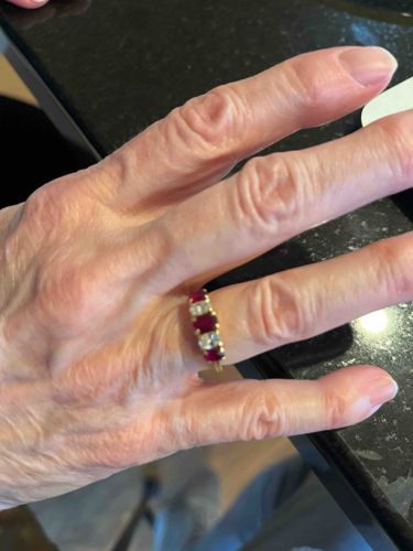 This is a classic five-stone alternating anniversary-style ring, meticulously crafted in what appears to be 14k or 18k yellow gold. The ring features three vibrant red, oval-cut rubies alternating with two bright, round-cut colorless diamonds. The gemstones are securely held in a traditional shared-prong setting, which allows for maximum light exposure and highlights the stones' natural brilliance. The central stone is a ruby, flanked by diamonds and then two additional rubies at the outer edges, creating a symmetrical and balanced aesthetic across the top of the finger. The rubies exhibit a deep, saturated pinkish-red hue characteristic of quality gemstones, while the diamonds offer a sharp, colorless contrast. Based on the construction and stone arrangement, this piece likely dates from the late 20th century, approximately 1980s to 1990s. The gold band appears to be in good vintage condition with minor surface scratches consistent with age and regular wear. There are no immediate signs of significant damage or gemstone chipping visible from the overhead perspective, though the prongs show slight wear typical of an older piece. This style of ring remains a timeless example of fine jewelry craftsmanship, often used to commemorate milestones or anniversaries.