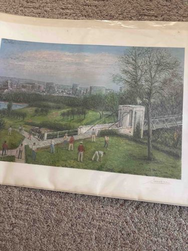 This item is a rectangular art print, likely a lithograph or high-quality offset print, depicting a pastoral landscape with several figures engaged in an outdoor activity such as croquet or archery on a green lawn. The composition features a white structural bridge or gateway in the mid-ground, a large deciduous tree to the right, and a distant cityscape under a pale, hazy sky. The color palette consists of muted greens, soft blues, and earthy tones with pops of red and white from the figures' clothing. The print is executed on a heavy white paper stock and appears to be housed within a protective plastic sleeve or shrink-wrap. A notable feature is a cursive signature in the lower right margin, which appears to read 'Sanders' or a similar name. The style suggests a mid-to-late 20th-century aesthetic, mimicking earlier 19th-century naturalist painting styles. In terms of condition, the paper shows visible rippling and slight creasing, particularly along the bottom edge, indicating it is currently unframed and may have been subject to humidity changes. There are no immediate signs of foxing or significant staining visible, though the edges of the paper appear slightly yellowed. The craftsmanship of the print shows fine line work and a stippled texture common in lithographic reproduction, suggesting it was produced as a limited or commercial decor edition.