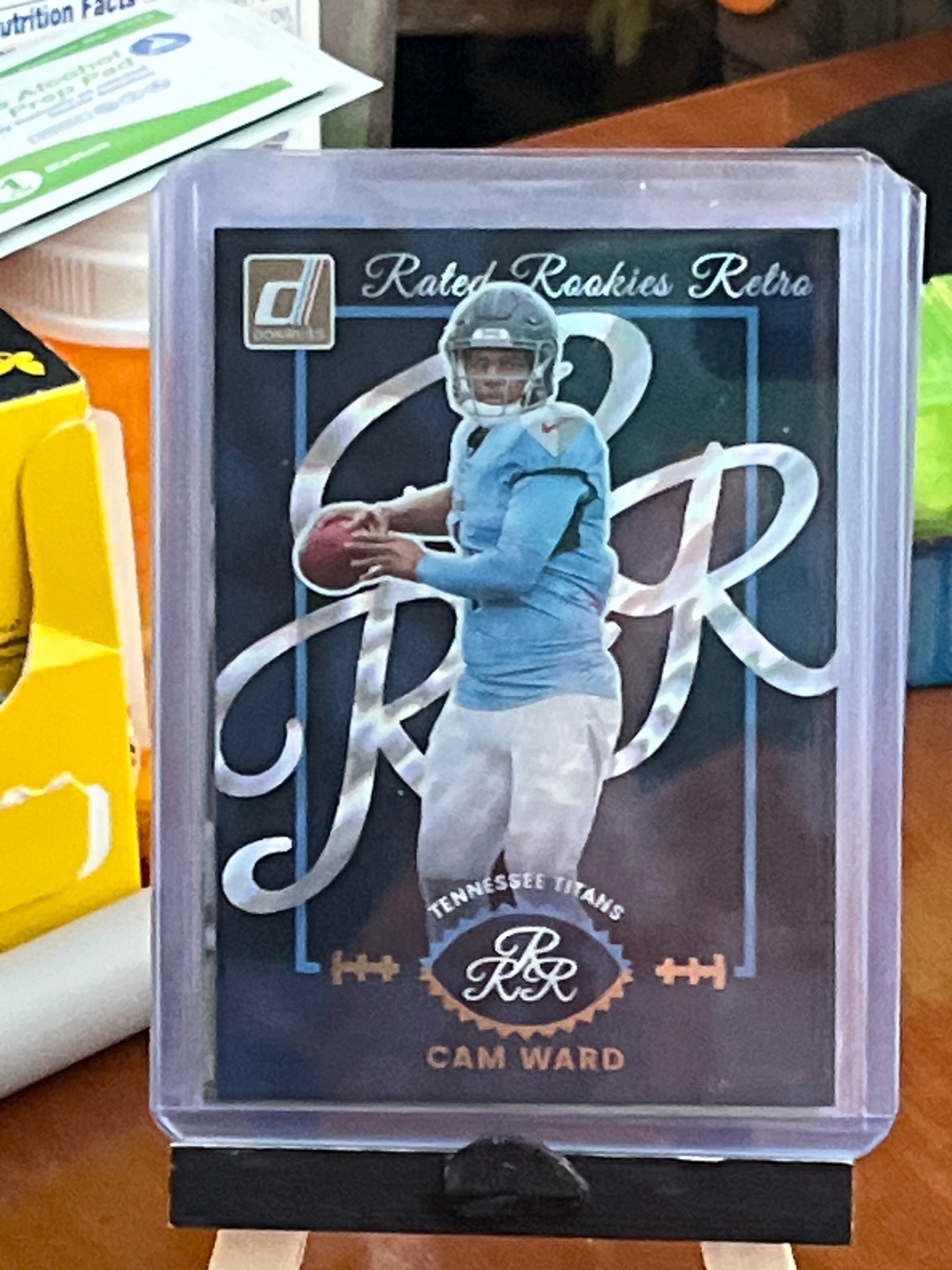 This is a modern sports trading card manufactured by Panini under the Donruss Elite brand, featuring quarterback Cam Ward in a Tennessee Titans uniform. The design is a 'Rated Rookies Retro' insert, characterized by a dark background with a large, stylized silver foil 'RR' (Rated Rookie) graphic that spans the center of the card behind the player's action shot. The card features the 'Donruss d' logo in the top left and the 'Rated Rookies Retro' script in the top right. Below the player, the team name 'Tennessee Titans' is arched over an 'RR' seal, with 'Cam Ward' printed at the bottom. The card is standard size (2.5 x 3.5 inches) constructed from high-quality cardstock with a glossy finish and selective holofoil/silver foil layering. It is currently housed in a clear protective top-loader. The condition appears excellent with clean edges and corners visible through the case, though physical inspection would be required to confirm surface perfection or centering exactness. As a 'Retro' themed card, it utilizes an aesthetic reminiscent of 1990s-era Donruss designs while incorporating modern print technology.