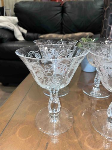 This is a set of elegant stemware, specifically identified as the Fostoria 'June' pattern on the #6017 stem, which was produced between 1928 and 1944. Each glass is crafted from high-quality clear crystal featuring a delicate, wheel-etched design that depicts a dense floral and ribbon motif, typical of the Depression-era elegant glass style. The physical construction consists of a wide, flared conical bowl attached to an ornate baluster-style stem with a thumbprint or faceted knop, resting on a flat, circular foot. The etching is exceptionally fine, showcasing intricate bows and trailing floral garlands that wrap around the bowl. In terms of condition, the crystal appears bright and clear with no visible cloudiness or 'sick' glass. There are no obvious large chips or cracks visible in the primary glass shown, though typical signs of age such as faint surface scratches or 'shelf wear' on the base of the foot would be expected for pieces of this vintage. The craftsmanship reflects the premium manufacturing standards of the Fostoria Glass Company of Moundsville, West Virginia, during their peak production years. This pattern is highly collectible and exemplifies the Art Deco influenced 'Excelsior' or top-tier glassware sought after by collectors of mid-20th-century Americana.