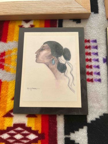 This item is a framed print or lithograph by the renowned Navajo artist Rudolph Carl Gorman (R.C. Gorman). The artwork depicts a profile view of a Native American woman, a recurring and iconic motif in Gorman's body of work. The subject is rendered with soft, fluid lines and a subtle color palette featuring muted earth tones and a prominent turquoise-colored earring that provides a focal point. The figure has dark hair styled in traditional buns, with loose wisps that demonstrate the artist's signature lyrical line work. The piece is signed 'R.C. Gorman' in the lower-left quadrant in his characteristic script. It is mounted on a cream-colored paper backing and set within a wide, dark espresso-colored or black wooden frame. The artwork appears to be a smaller-scale print, likely a decorative open-edition lithographic reproduction common in the late 20th century (circa 1980s-1990s). The condition of the frame shows some minor surface dust and light handling marks, while the print itself appears well-preserved under glass without visible foxing or fading, though the paper has a natural off-white tone. The minimalist style and focus on female strength and grace are representative of the 'Picasso of American Indian Artists.'
