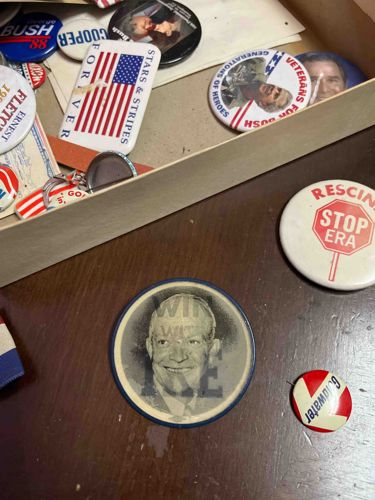 This is a diverse collection of vintage American political campaign memorabilia, specifically pin-back buttons spanning several decades from the mid-20th century to the late 1980s. The focal piece is a large circular celluloid button featuring a black-and-white portrait of Dwight D. Eisenhower with the superimposed text 'WIN WITH IKE,' dating to the 1952 or 1956 presidential campaigns. This button has a dark blue border and shows significant age-related yellowing and foxing on the surface. Nearby is a smaller red, white, and blue 'Goldwater' pin from the 1964 campaign and a 'STOP ERA' button, which reflects the political activism of the 1970s. Inside the box, a 'Bush 88' button is visible, indicating the collection includes more modern 1980s pieces. Other items include a 'Veterans for Bush' button featuring George H.W. Bush, a 'Stars & Stripes Forever' rectangular pin with an American flag, and a small circular 'Cooper' pin. The materials are primarily lithographed tin and celluloid over metal. Condition varies across the lot; while some buttons appear bright with intact gloss, others show visible surface oxidation, scratches, and significant atmospheric toning typical of long-term storage in a non-climate-controlled environment. There are no immediate maker's marks visible on the faces, but such items typically feature union bugs or manufacturer stamps on the reverse or edge.