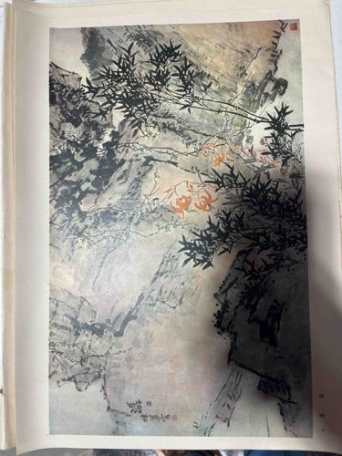 This item is a printing or reproduction of a traditional Chinese Shan Shui (landscape) style ink and wash painting. The composition features rhythmic clusters of bamboo leaves in dark ink, delicately rendered orange lilies, and rugged rock formations in the background. The color palette is predominantly muted, utilizing earthy tones and greyscale washes with pops of cinnabar-orange. It is presented on a vertical paper support with a wide white margin typical of an art plate or book illustration. Notable markings include a red artist's seal (typically a name seal or mood seal) in the upper right corner and calligraphic inscriptions with a smaller seal in the lower-middle section, which usually identifies the artist or the poem associated with the scene. The style reflects 20th-century adaptations of classical Ming or Qing dynasty techniques, emphasizing fluid brushwork and atmospheric perspective. The condition shows minor yellowing of the paper edges (foxing) and some slight curling, consistent with age-related display or storage in a folio. The craftsmanship indicates a high-quality lithographic or offset print process, capturing the nuanced texture of the original ink washes.