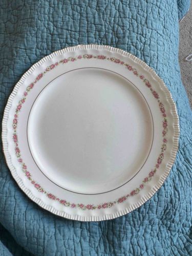 This is a vintage dinner plate manufactured by the Pope-Gosser China Company, an esteemed American pottery firm based in Coshocton, Ohio. The plate features a cream-colored translucent porcelain body with a distinctive pie-crust or scalloped 'Ransom' style rim. The most prominent decorative element is a continuous floral band encircling the verge, consisting of small pink roses and delicate green foliage. The extreme edge of the scalloped rim is finished with a thin, hand-painted gold gilt line, which serves to highlight the textured fluting of the ceramic mold. Based on the documented 'Pope Gosser China Made in USA' backstamp within a wreath, this piece likely dates to the mid-20th century, specifically between the 1930s and 1950s. The craftsmanship is typical of high-quality American semi-vitreous dinnerware of the era. Regarding condition, the plate appears well-maintained with visible gold loss on the high points of the scalloped rim due to age and handling. There is a small visible nick or flea bite on the top edge between the 11 and 12 o'clock positions. The glaze remains bright with no significant surface crazing or deep utensil scratching apparent in the current lighting.