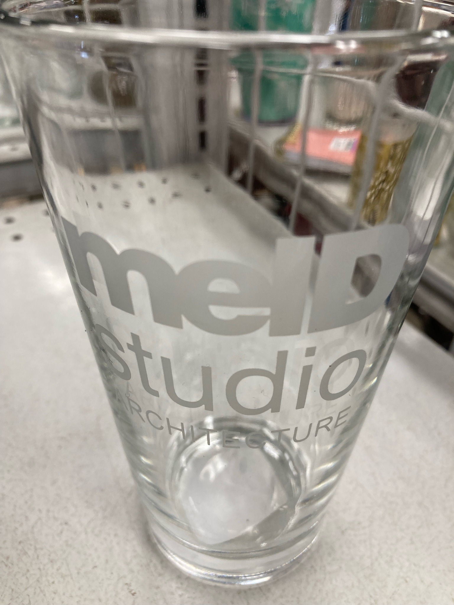 This is a standard 16-ounce conical pint glass, often referred to as a Shaker glass, featuring promotional branding. The glass is made of clear, machine-pressed soda-lime glass with a weighted, reinforced base for stability. Centered on the body is a multi-line graphic printed in a frosted or matte silver-grey ink. The primary text reads 'meld' in a bold, lowercase sans-serif font, followed by 'studio' in a lighter weight sans-serif, and the word 'ARCHITECTURE' in a smaller capitalized block font at the bottom. The glass exhibits a slight taper from the wide rim down to the narrow base. In terms of condition, the glass appears to be in used but good vintage/modern condition; there are visible water spots, minor surface scratches, and dust accumulation consistent with storage in a retail or thrift environment. No significant chips or cracks are visible at the rim or base. This item likely dates from the late 20th to early 21st century, produced as a corporate gift or promotional piece for Meld Studio, an architectural firm. The craftsmanship is typical of high-volume commercial glassware intended for everyday use.