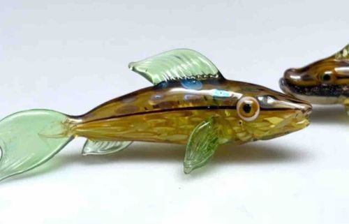 This is a finely crafted miniature glass figurine of a fish, likely produced using the lampwork technique. The piece features a complex multi-tonal body with a base of amber and yellow-gold glass, internally decorated with metallic flecks or 'aventurine' inclusions that create a shimmering, scaly effect. The dorsal and caudal fins are fashioned from a transluscent pale green glass, exhibiting delicate ribbing created through tool manipulation while the glass was molten. The head features prominent murrine-style eyes with deep brown centers surrounded by a white ring, giving the piece a lifelike, expressive quality. Small blue spots are visible along the spine, adding a vibrant contrast to the earth-toned palette. The craftsmanship suggests a mid-to-late 20th-century origin, consistent with Italian Murano traditions or high-quality studio glass. Condition appears excellent with no visible chips, cracks, or repairs, maintaining a high-gloss flame-polished finish that reflects light beautifully across its streamlined form.