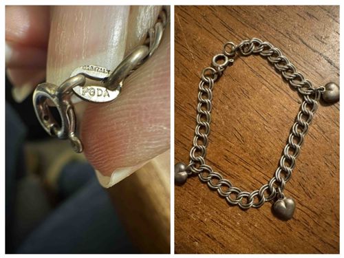 This is a vintage-style sterling silver charm bracelet featuring a double-link curb or oval cable chain construction. The craftsmanship originates from Italy, a region renowned for high-quality silver chain production. The piece is adorned with three small, puffed heart-shaped charms evenly spaced along the length of the chain. Measuring approximately 7 to 7.5 inches in length, the bracelet is secured by a standard spring ring clasp. A hallmark tag near the clasp is clearly stamped with '925 ITALY' on one side and 'PGDA' on the other, identifying it as high-grade sterling silver produced by the Pagoda brand. The silver exhibits a significant amount of dark tarnish and oxidation (patina), which is common for aged sterling silver and indicates it has not been recently polished. There appear to be no broken links or missing charms, though there is general surface wear and light scratching consistent with age and use. The double-link design provides a sturdy yet decorative aesthetic, characteristic of late 20th-century costume jewelry trends.