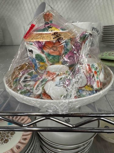 This is a multi-piece porcelain tea set wrapped in protective plastic, featuring a teapot, multiple small teacups, and a large shallow serving bowl or basin. The set is decorated in a vibrant Famille Rose style, characterized by a busy, polychrome palette featuring pink, orange, green, and blue enamels. The design includes narrative scenes with figures in traditional attire, interspersed with large floral blooms such as peonies and green foliage. A prominent golden-yellow Greek key (meander) border encircles the shoulder of the teapot and the rim of the outer vessel. The teapot features a globular body with a curved spout and a domed lid topped with an orange floral finial. The craftsmanship appears to be 20th-century decorative export ware, likely from China or Hong Kong. The glaze has a high-gloss finish, and the application of colors suggests hand-painted details over transfer-printed outlines. While the plastic wrapping obscures some fine details, the items appear to be in good structural condition with no obvious chips or cracks visible through the packaging. A handwritten price of 24.99 is visible on the plastic. This set serves as a decorative example of traditional Chinoiserie aesthetic suited for display or functional tea service.